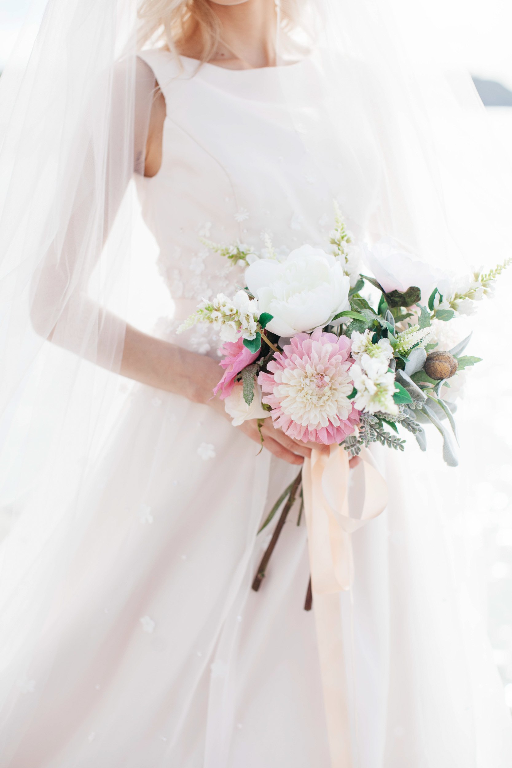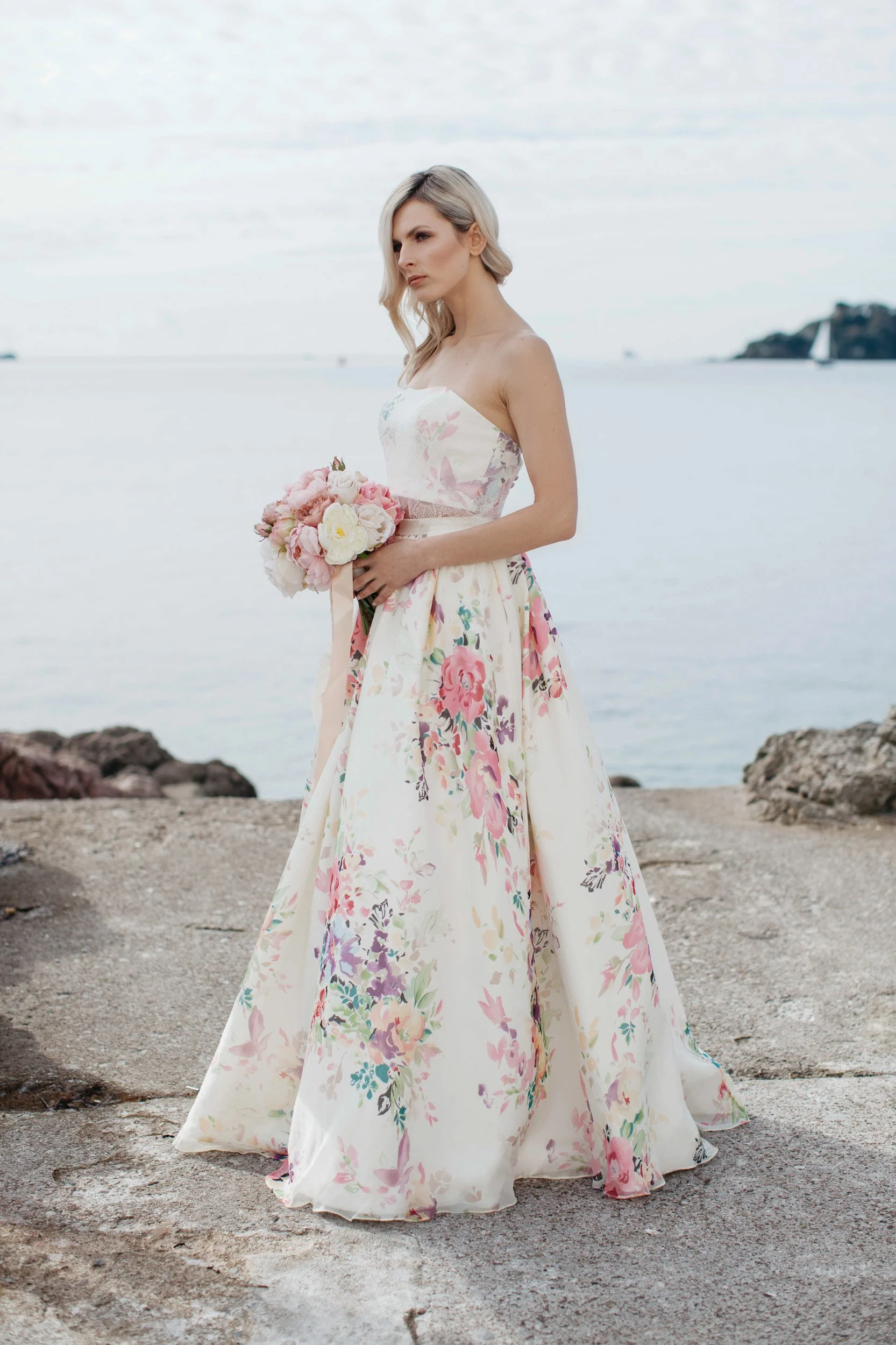 For this photoshoot we headed right down to almost sea level, placing the bride on the rocks . We chose to shoot these bridal portraits a couple hours off sunrise to have the sparkle of the sun shining on the sea to give that warm subtle glow.