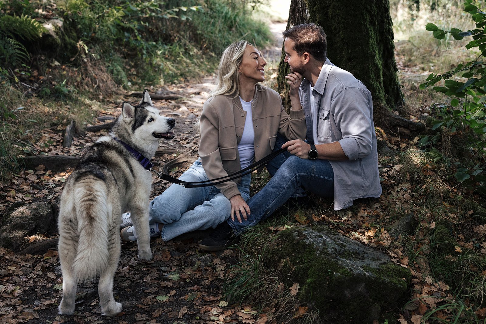 They also brought along their dog, Luna for some extra photos of the three of them, which added so much personality to the session. She trotted happily beside us, walking through the woods, pausing for cuddles, and generally making sure she was part of the photos too.