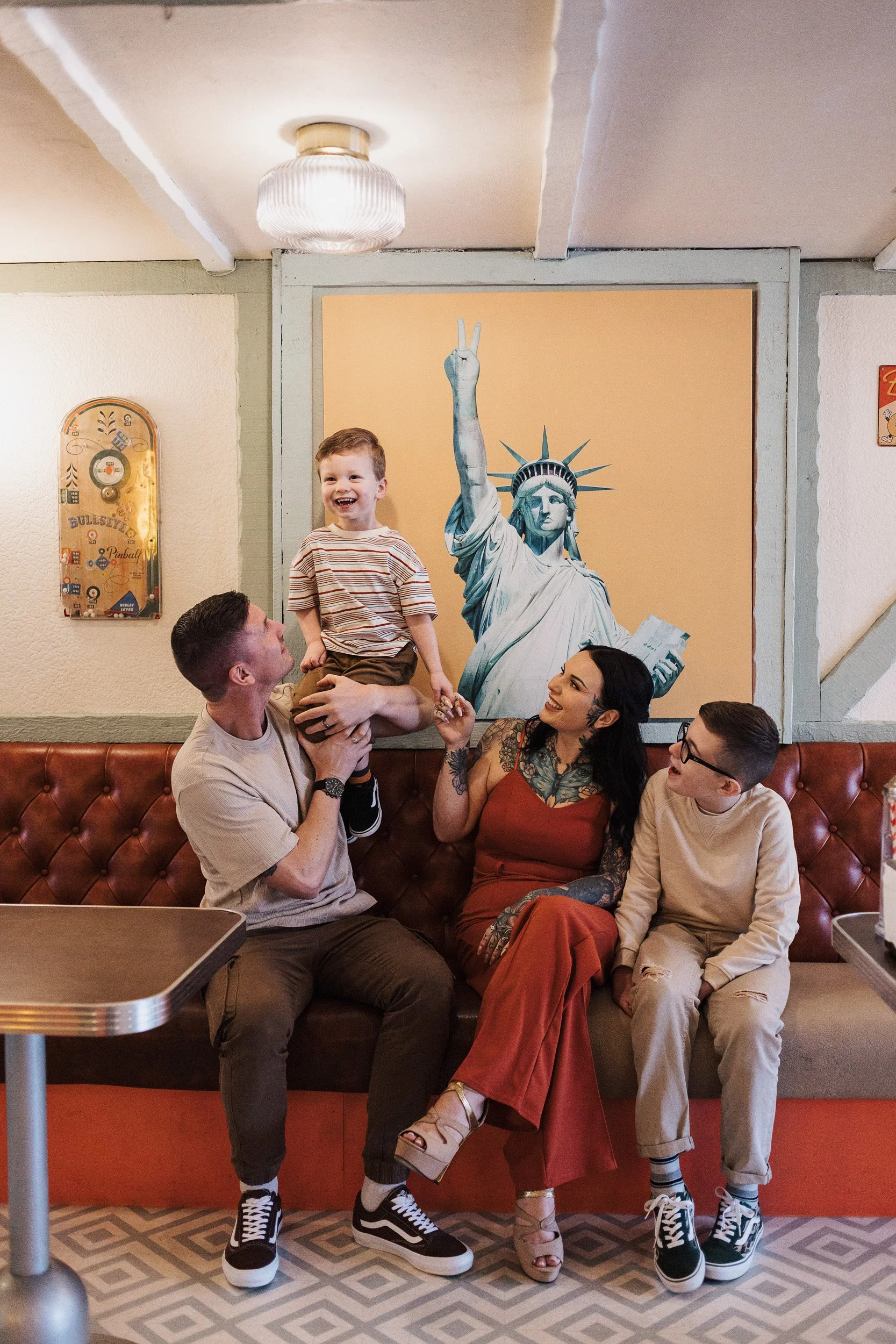 As an editorial storytelling photographer, I'm constantly seeking unique locations and moments that tell a beautiful narrative. Dimpsy's was the perfect backdrop for this family's story, a place where nostalgia and modern flair seamlessly connect. The creativity was in buckets when in the diner, it was like stepping into a time capsule, with vibrant colours, classic branding, and a sense of warmth.