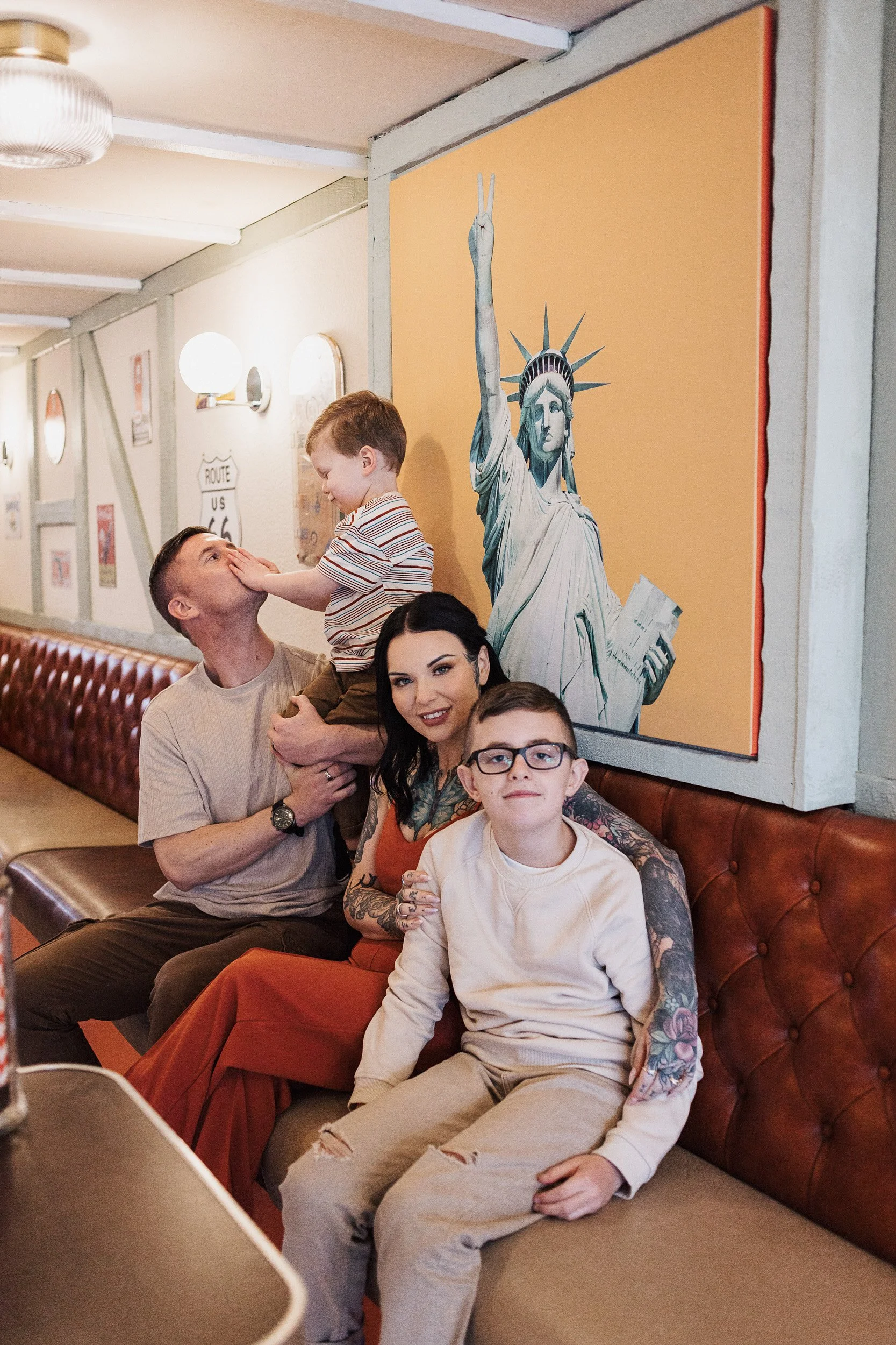 I had the privilege of capturing this beautiful family at a charming American styled diner called Dimpsy's in Plymouth Devon, serving up mouthwatering vegan delicacies, with retro tunes filling the air.