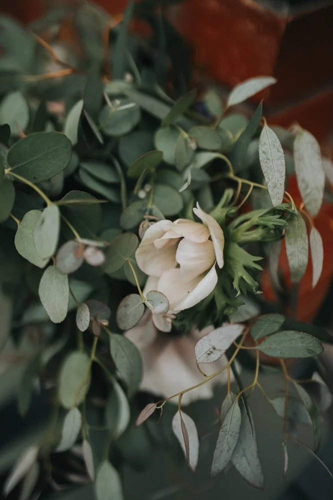 10. Now you want to arrange your flowers onto the frame. Have a play to see what fits where best, this can take a few attempts. I started with layering my eucalyptus leaves and stems first, giving it a base. Then I layered some smaller leaves for texture before finally placing my anemone on top.